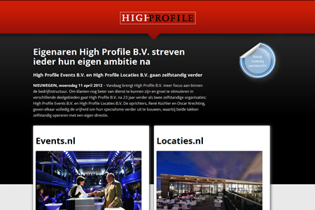 De toekomst voor High Profile: High Profile B.V. heeft de afgelopen jaren een succesvolle transitie gemaakt naar online activiteiten (o.a. Highprofile.nl, Event-jobs.nl, Locaties.nl en Toptrouwlocaties.nl), waar in oorsprong de expertise in print lag. Zowel High Profile Events B.V. als High Profile Locaties B.V. behouden de ingezette koers met een focus op het internet. De website Highprofile.nl verwijst bezoekers naar de verschillende specialismen: Events.nl en Locaties.nl.