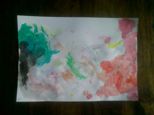 Ons Prulleke van drie-en-een-half wil iedere week verven tegenwoordig. De koelkast hangt vol met de meest kleurrijke exemplaren. Deze hieronder vinden we zo uniek, die willen graag met jullie delen. Kijk er maar eens naar en denk er gerust het jouwe van. We vinden het nog wat vroeg om haar in te schrijven voor de kunstacademie, maar…